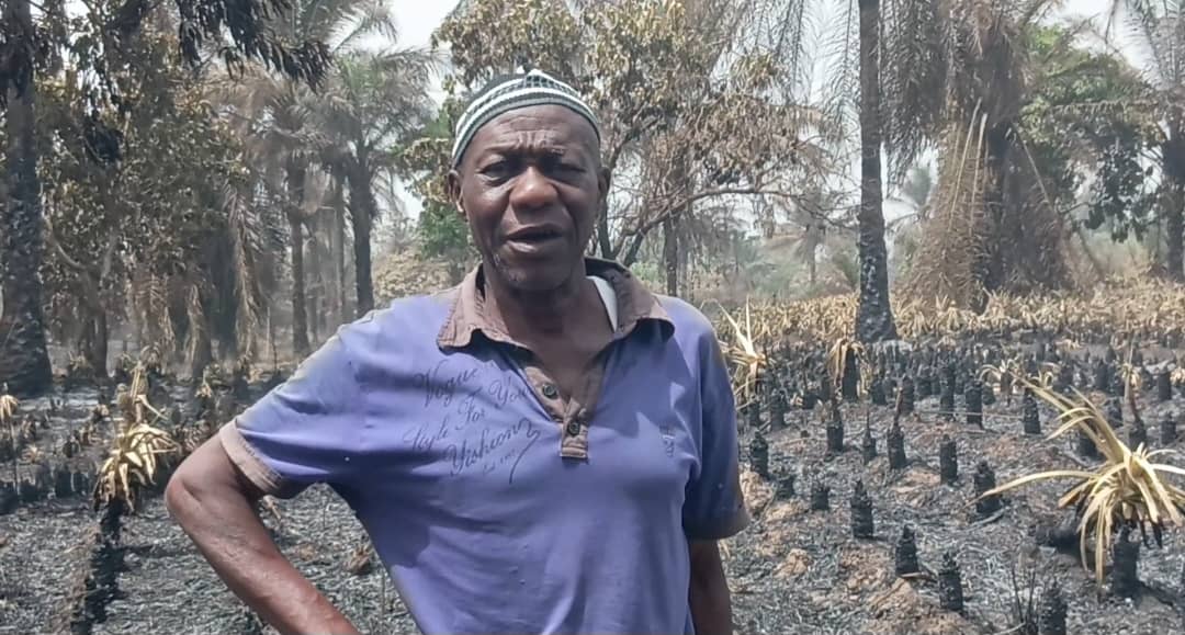 « Nous sommes venus travailler ici avant de rentrer à la maison. Après la prière de 14 heures, nous avons reçu un appel disant que le champ de notre voisin avait pris feu. Nous sommes revenus précipitamment et avons constaté une énorme perte. Il nous a fait parcourir toute la plantation, mais rien n’est resté. Nous ne savons pas qui a mis le feu. Nous demandons aux personnes de bonne volonté de nous aider afin qu’il puisse rembourser ses dettes. Il n’a plus rien maintenant. Nous nous remettons à Dieu. »