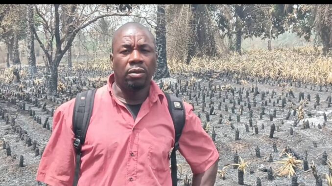 « Nous sommes venus travailler ici avant de rentrer à la maison. Après la prière de 14 heures, nous avons reçu un appel disant que le champ de notre voisin avait pris feu. Nous sommes revenus précipitamment et avons constaté une énorme perte. Il nous a fait parcourir toute la plantation, mais rien n’est resté. Nous ne savons pas qui a mis le feu. Nous demandons aux personnes de bonne volonté de nous aider afin qu’il puisse rembourser ses dettes. Il n’a plus rien maintenant. Nous nous remettons à Dieu. »